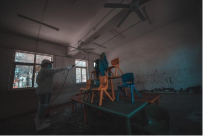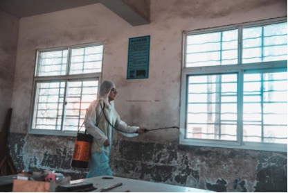 接着,队员们在朱校长的引导下开始对学生教室和教师办公室开展消毒工作。全副武装的同学们身穿防护服、肩背消毒喷雾器,忍受着消毒剂的刺激气味,严格按照规范的消毒程序对学校楼层教室、走廊、楼梯、库室、操场、办公室、厕所等重点活动场所全面细致的消毒灭菌,不遗漏一个角落。