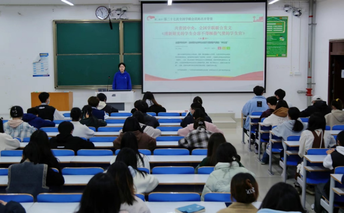 会上,许孟杨老师讲到,学生会成员要深入学习全国学联二十七大会议精神,始终坚持从学生中来,到学生中去。随后,由学生会主席团成员杨嘉宁带领参会成员深入解读习近平总书记致全国学联二十七大的贺信、大会致词、全国学联大会报告、郑富芝同志在全国学联二十七大闭幕上的讲话等内容。