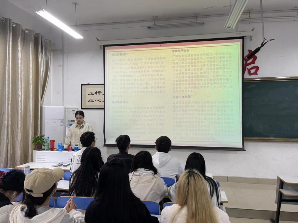 本次培训会新葡官网学生会主席团成员杨嘉宁带领与会成员学习了《关于巩固高校学生会(研究生会)改革成果的若干措施》和《关于学联学生会工作人员改进作风服务同学的若干规定》相关内容。她从把牢政治方向、加强领导指导、当好桥梁纽带、抓实队伍建设等方面对相关内容进行了深入解读。强调学生会成员应该恪守学生本分、牢记服务宗旨、永葆情怀理想、勤勉务实做事。