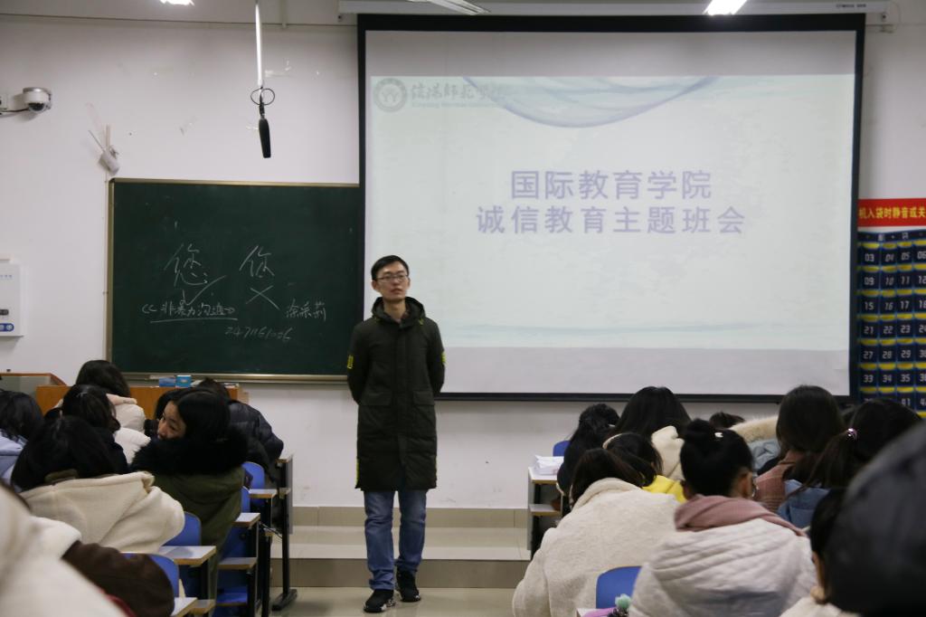 此次活动的目的是提高同学们的诚信意识,引导同学们在大学生活中始终贯彻诚信做人做事的原则。主讲人吴浩老师围绕班会主题,将说理和论证结合,逐步深入,向同学说明了诚信的重要性。首先,抛出“诚信在大学生活中有何作用”这一问题,引发了同学们的热烈讨论。在总结整理了诚信的几大作用之后,又播放了宣传诚信的动漫短片,使同学们更加直观地理解了诚信的概念和意义。接下来,班会从学术诚信、奖助学金申请诚信和求职诚信就业三个方面进行了具体阐述,并联系社会现实,通过对当今社会中的热点话题,如“北电硕士翟天临学术造假”事件、“某高校富二代伪造材料申请贫困生助学金”事件和毕业生求职履历造假等现实社会问题的分析,以及对失信者心理和失信原因的深入探究,明确了失信问题的严重性。同时,吴老师还列举了大学生诚实守信方面的正面事例,倡导同学们自觉走诚信道路。最后,全体同学一起演唱了《诚信之歌》。在悠扬的歌声中,本次主题活动圆满结束。