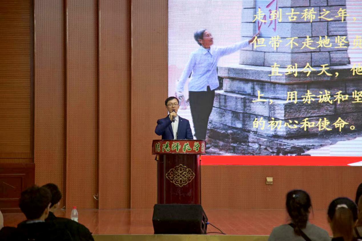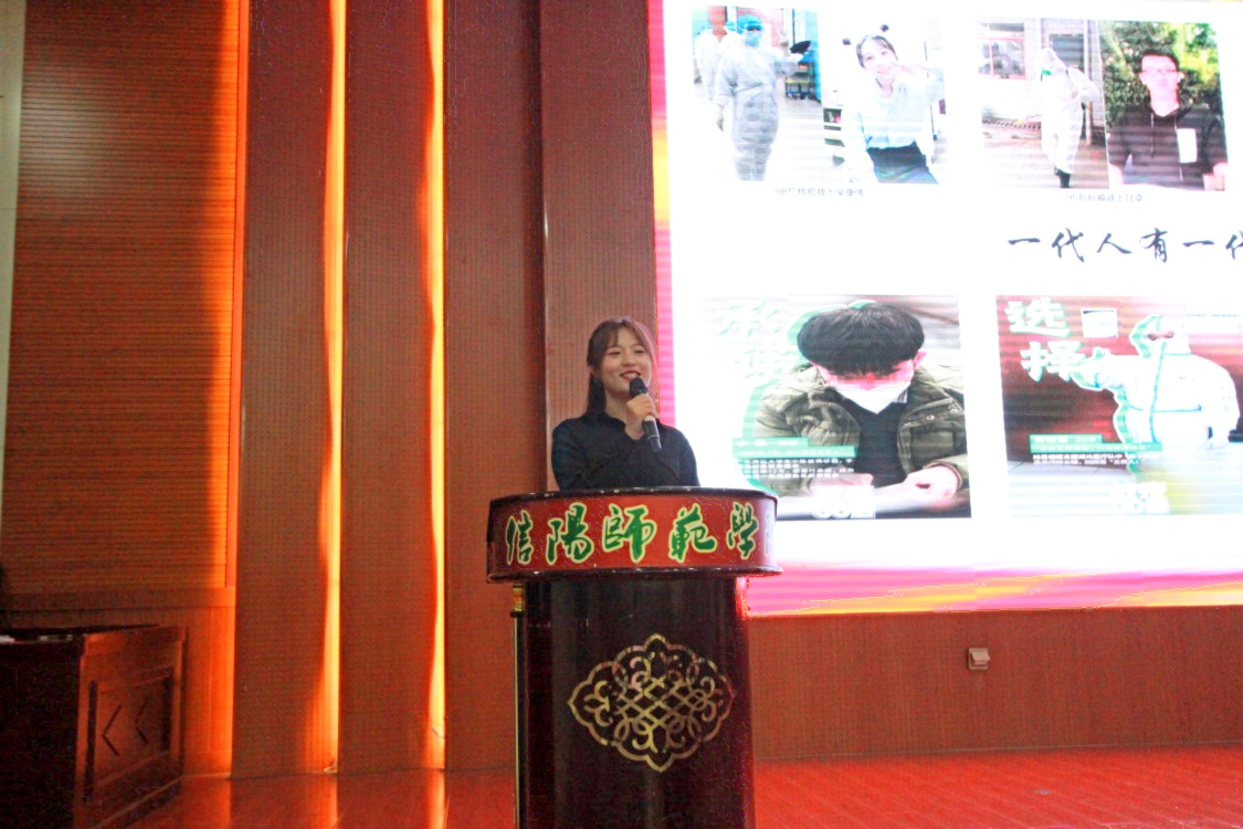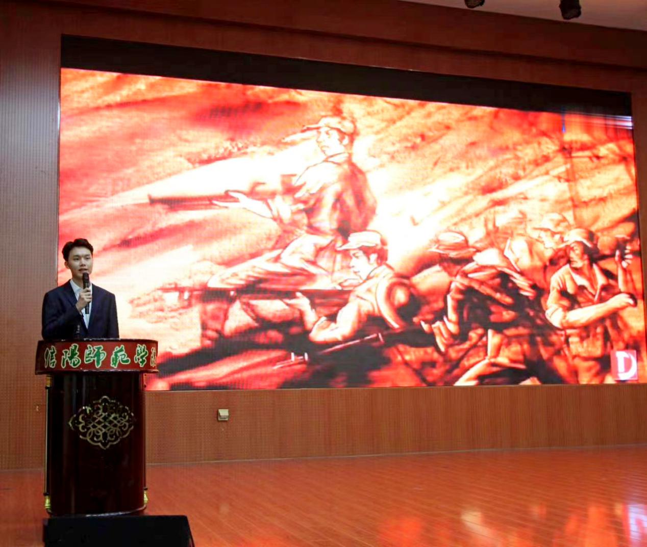 吴浩老师首先讲述了“红军洞的守护者“张爱华老人的故事,以老党员张爱华57年默默奉献、舍身忘我,义务守护“红军洞”的感人事迹,引导20级新生感悟共产党员初心如磐的坚定信念;学生代表贾政澎分享年仅28岁的共产党员查茂德不畏牺牲,与妻子诀别时留下的感人书信,讲述了一段荡气回肠的英雄事迹;