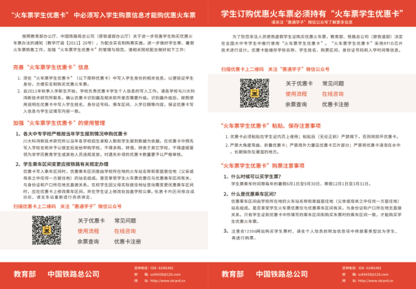 若有任何疑问,老师可致电028-61481462或技术支持电话15198059811、15198059812咨询,学生可扫描优惠卡上的二维码关注“惠通学子”微信公众号了解学生资质绑定相关内容,学生在购票或在车站绑定资质遇到问题时,可在公众号内在线咨询。
