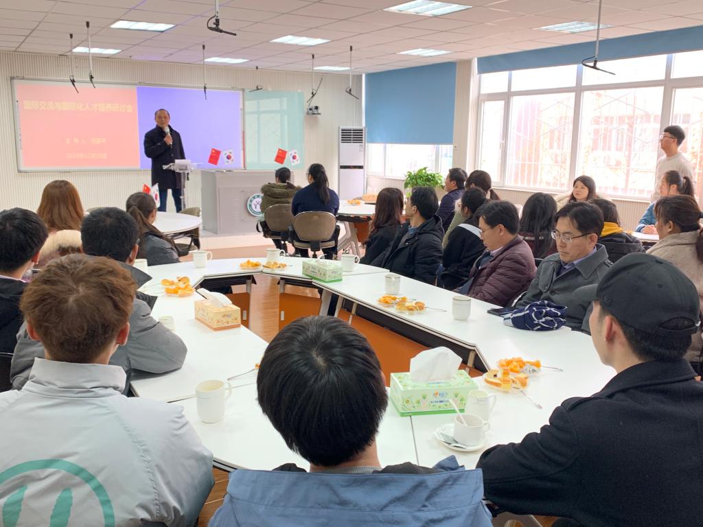 研讨会主要围绕新时期高校国际交流与国际化人才培养、我校师生如何通过合作项目留学汉阳大学等问题进行了探讨和交流。何英干副院长就目前国教院的国际交流与项目学生的外语教学和专业课程建设等问题与韩国教授交换了意见,同时介绍了我校学生出国留学方面的相关优惠政策和规定。汉阳大学分子生命科学专业金晓骏(HyoJoon Kim)教授和土木工程专业安镕翰(YongHan Ahn)教授分别介绍了两个专业的国际化办学目标和人才培养情况,我校青年教师也就相关专业问题与韩国教授进行了深入研讨,并分享了学术前沿相关研究成果。
